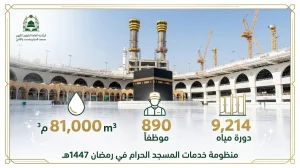 استهلاك 81 ألف متر مكعب من المياه لتنظيف المسجد الحرام وتجهيز 9214 دورة مياه في 15 يوماً من رمضان