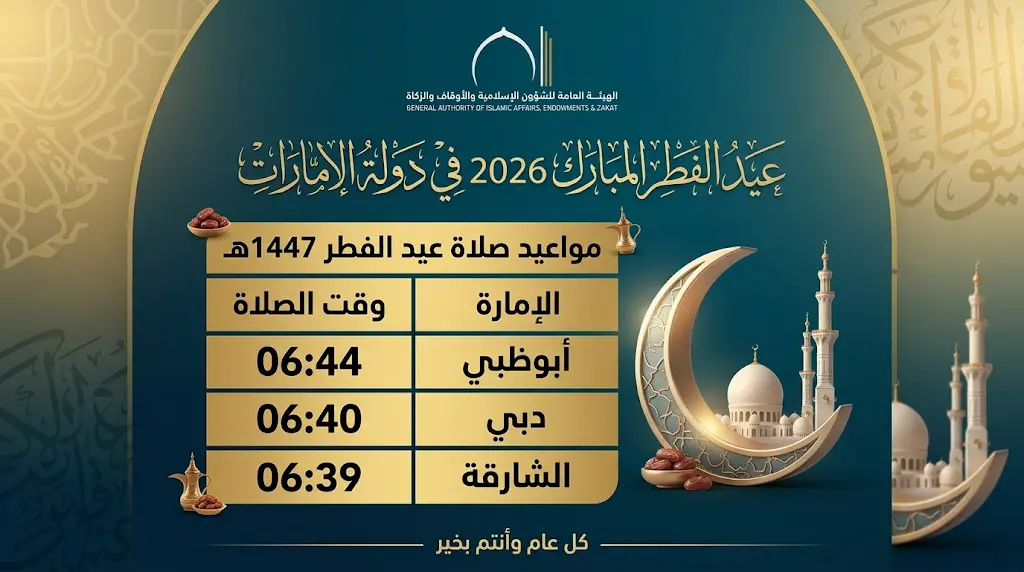 موعد أول أيام عيد الفطر 2026 في الإمارات الجمعة 20-03-2026 رسمياً