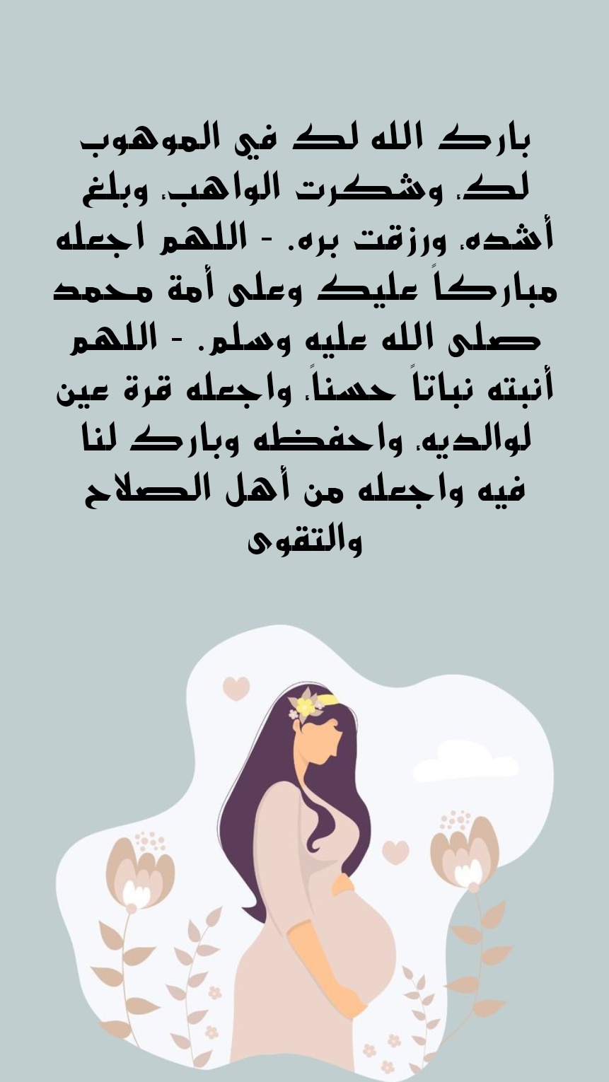 “بَارَكَ اللَّهُ لَكَ فِي الـمَوْهُوبِ لَكَ، وَشَكَرْتَ الوَاهِبَ، وبَلَغَ أشُدَّهُ، وَرُزِقْتَ بِرَّهُ”.