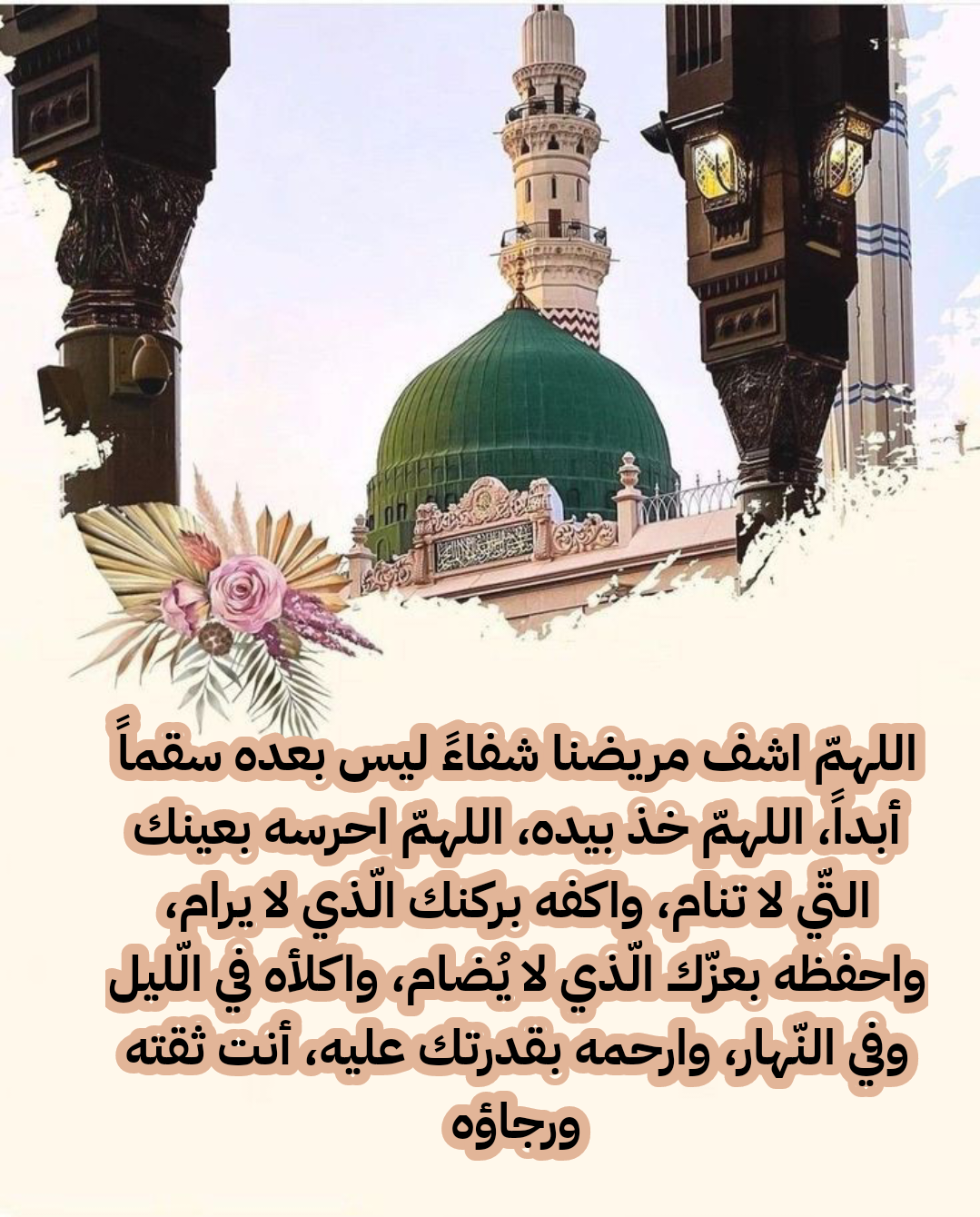 - اللهم باسمك الأعظم الذي إذا دُعيت به أجبت وبأسمائك الحسنى التي لا يحيط بها إلا علمك وبقدرتك التي تفوق كل تصور أسألك أن تكتب لنا الشفاء وأن تلبسنا لباس الصحة وتبعد عنا كل سقم وتحفظنا بحفظك الذي لا يرام.