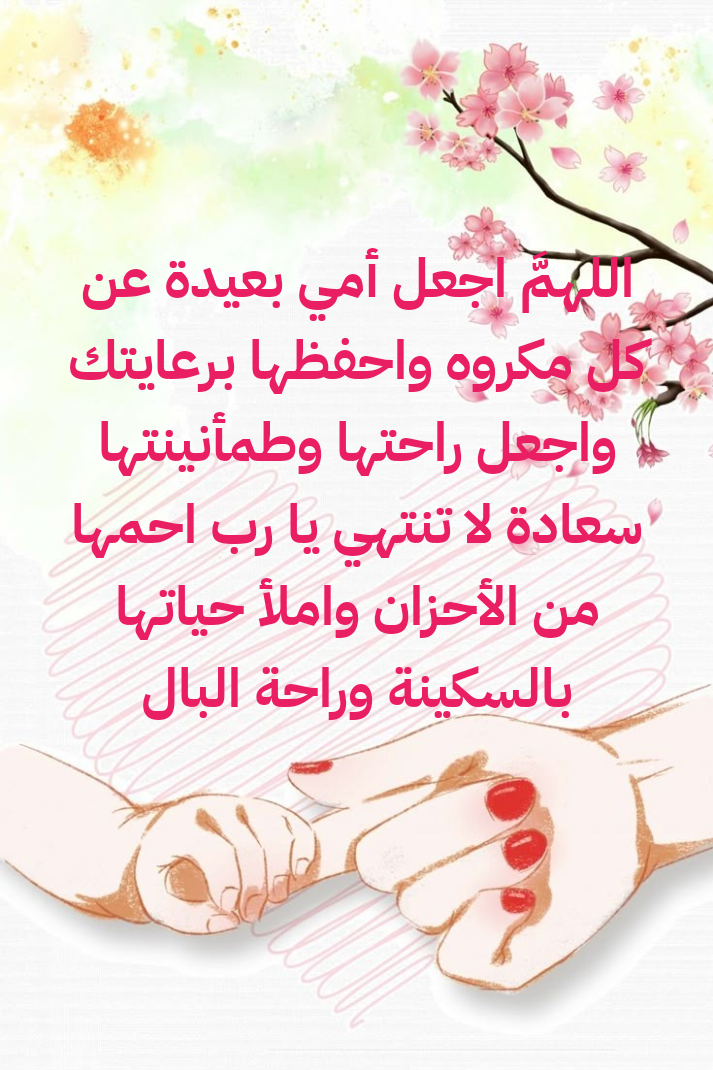 • اللَّهُمَّ أَقِرَّ عَيْنَ أُمِّي بِمَا تَتَمَنَّاهُ لَنَا فِي الدُّنْيَا، وَاجْعَلْهَا رَاضِيَةً مَرْضِيَّةً، وَامْلَأْ قَلْبَهَا بِالسَّكِينَةِ وَالطُّمَأْنِينَةِ، وَأَبْعِدْ عَنْهَا كُلَّ هَمٍّ وَغَمٍّ.