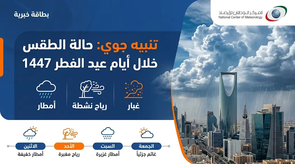 الأرصاد السعودية تحذر من تقلبات جوية وأمطار تستمر 4 أيام بدءاً من أول أيام عيد الفطر