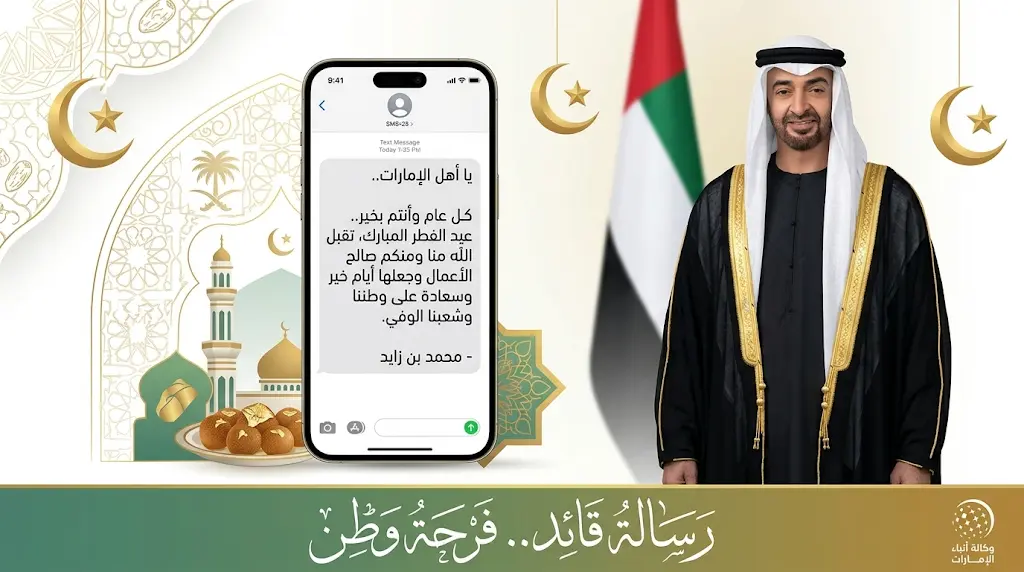 تهنئة الشيخ محمد بن زايد لمواطني ومقيمي الإمارات بعيد الفطر عبر رسائل نصية مباشرة