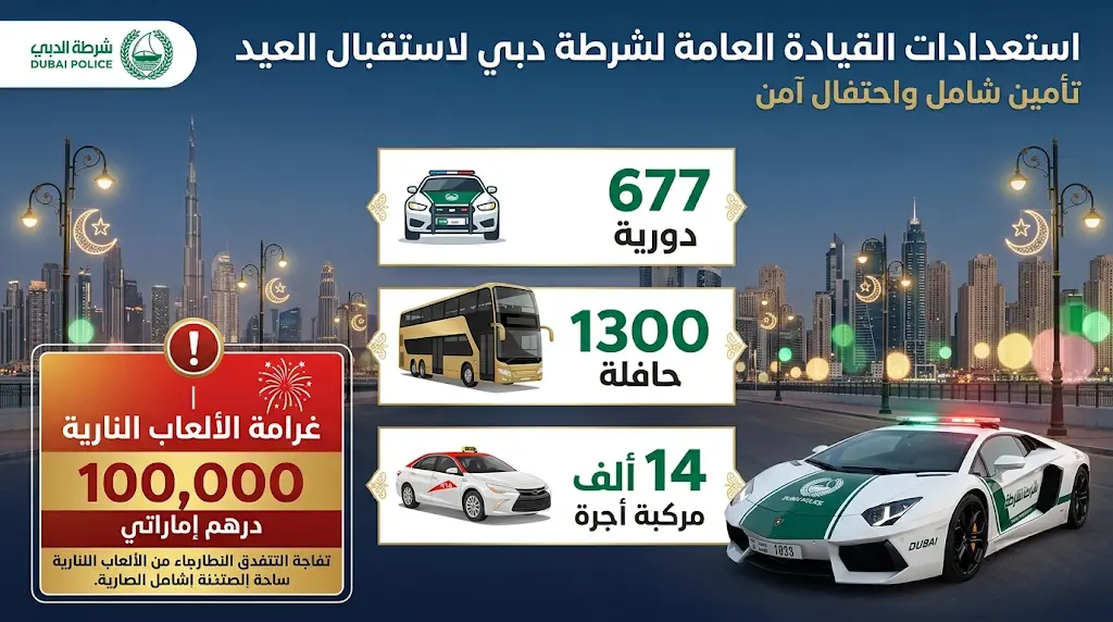 شرطة دبي تعلن تفعيل خطة ميدانية ضخمة بـ 677 دورية و14 ألف مركبة أجرة لتأمين احتفالات العيد