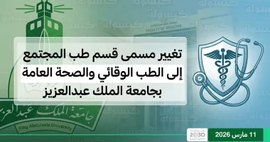 أصدرت إدارة جامعة الملك عبدالعزيز اليوم، الأربعاء 11 مارس 2026 (الموافق 22 رمضان 1447 هـ)، قراراً يقضي بتغيير مسمى قسم “طب المجتمع” بكلية الطب ليصبح قسم “الطب الوقائي والصحة العامة”، ويأتي هذا التعديل الجوهري لتعزيز دور الوقاية في المنظومة التعليمية والبحثية والخدمية للجامعة، وبما يتوافق مع التوجهات العالمية الحديثة في النظم الصحية التي تضع الوقاية قبل العلاج.