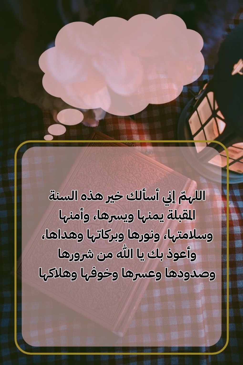 - اللهم إني أسألك خير هذه السنة المقبلة، فتيسيرها وبركتها وأمنها وسلامتها ونورها وأعوذ بك من شرورها وما فيها من صعوبة وخوف وهلاك وأدعوك يا الله أن تحفظ لي ديني الذي هو عصمة أمري ودنياي التي فيها رزقي ومعيشتي وأن توفقني فيها لما تحب وترضى يا أكرم الأكرمين يا أرحم الراحمين وصلى الله وسلم على سيدنا ونبينا محمد وعلى آله وصحبه أجمعين.