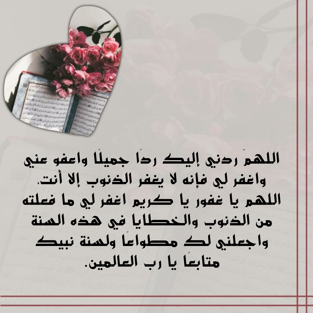 - اللهم إن كنتَ قد رضيت عن عمل لي في هذا العام فتقبله وزدني من فضلك، وإن كنت قد قَصَّرت فاغفر لي وأعفو عن زلّتي ولا تدعني وحيدًا دون رحمتك فأنت الكريم الرحيم الذي لا يُغلق بابه أبدًا أمام التائبين اللهم لا تجعل هذا العام ينقضي إلا وقد غفرت لنا ما تقدم من ذنوبنا وأصلحت قلوبنا وكتبت لنا الخير فيما تبقى من أعمارنا.