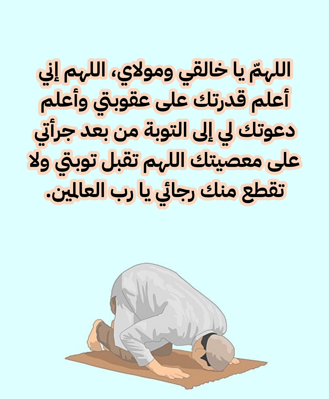 - اللهم إني أعلم أنك قادر على معاقبتي وأعلم أنك تدعوني إلى التوبة بعد جُرأتي على معصيتك فاغفر لي وتقبل توبتي يا كريم يا تواب يا ذا الجلال والإكرام ولا تحرمني من رحمتك.