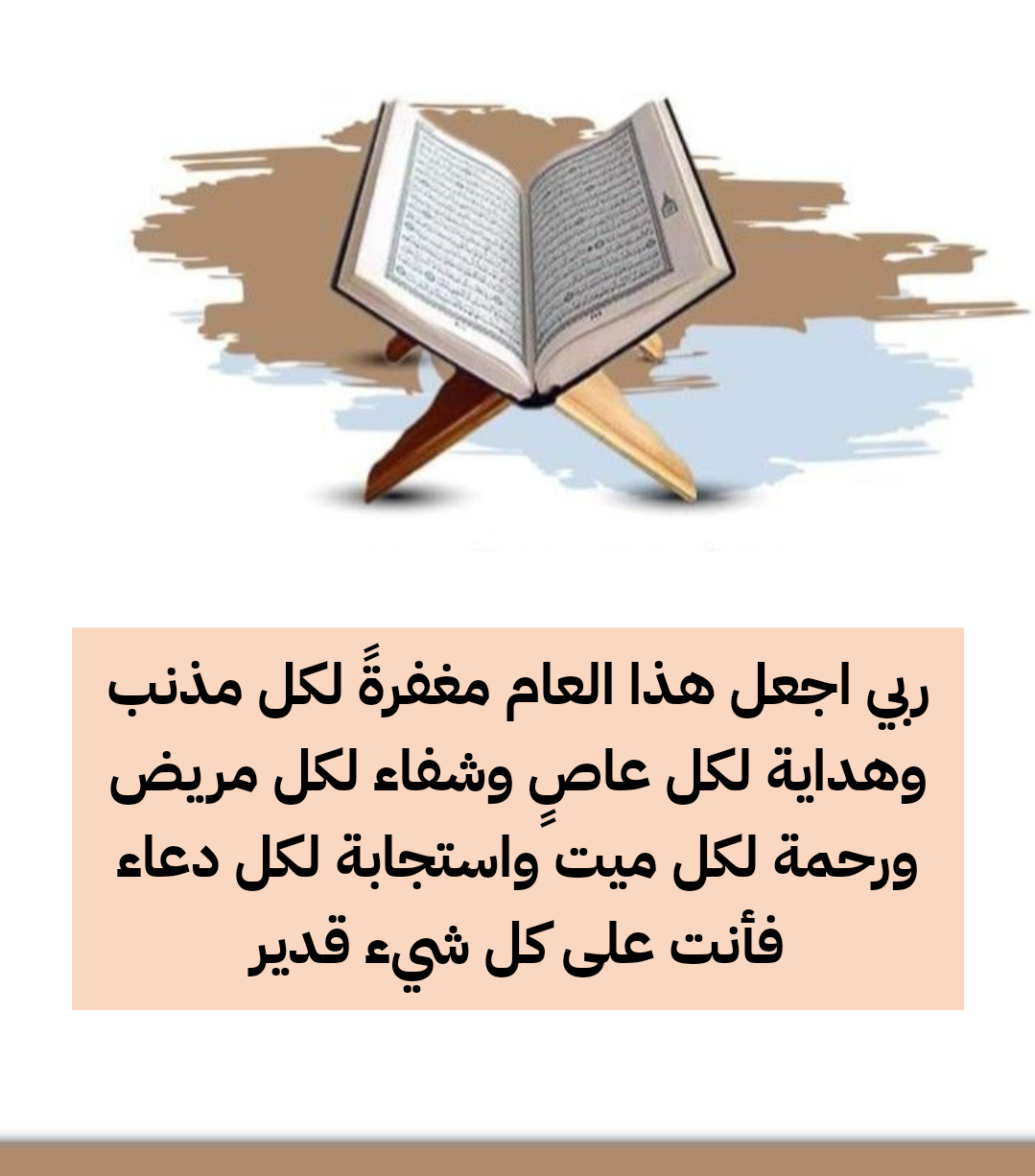 - دعاء العام الهجري اللهم أنر قلوبنا وقبورنا وطرقنا وأبصارنا وبصائرنا وسائر جوارحنا واجعلنا من أهل الفَجر ومن أهل القرآن وحامليه ومن أهل قيام الليل وأهل عليين وارزقنا يا رب العالمين رؤية النبي ﷺ في الدنيا والآخرة واجعلنا ممن يتبع سنته ويسير على نهجه… اللهم يسّر لنا من الأسباب ما يكون عونًا لنا في قضاء الدَّين وأغننا من الفقر وارزقنا تحقيق ما نتمنى في الدنيا والآخرة.