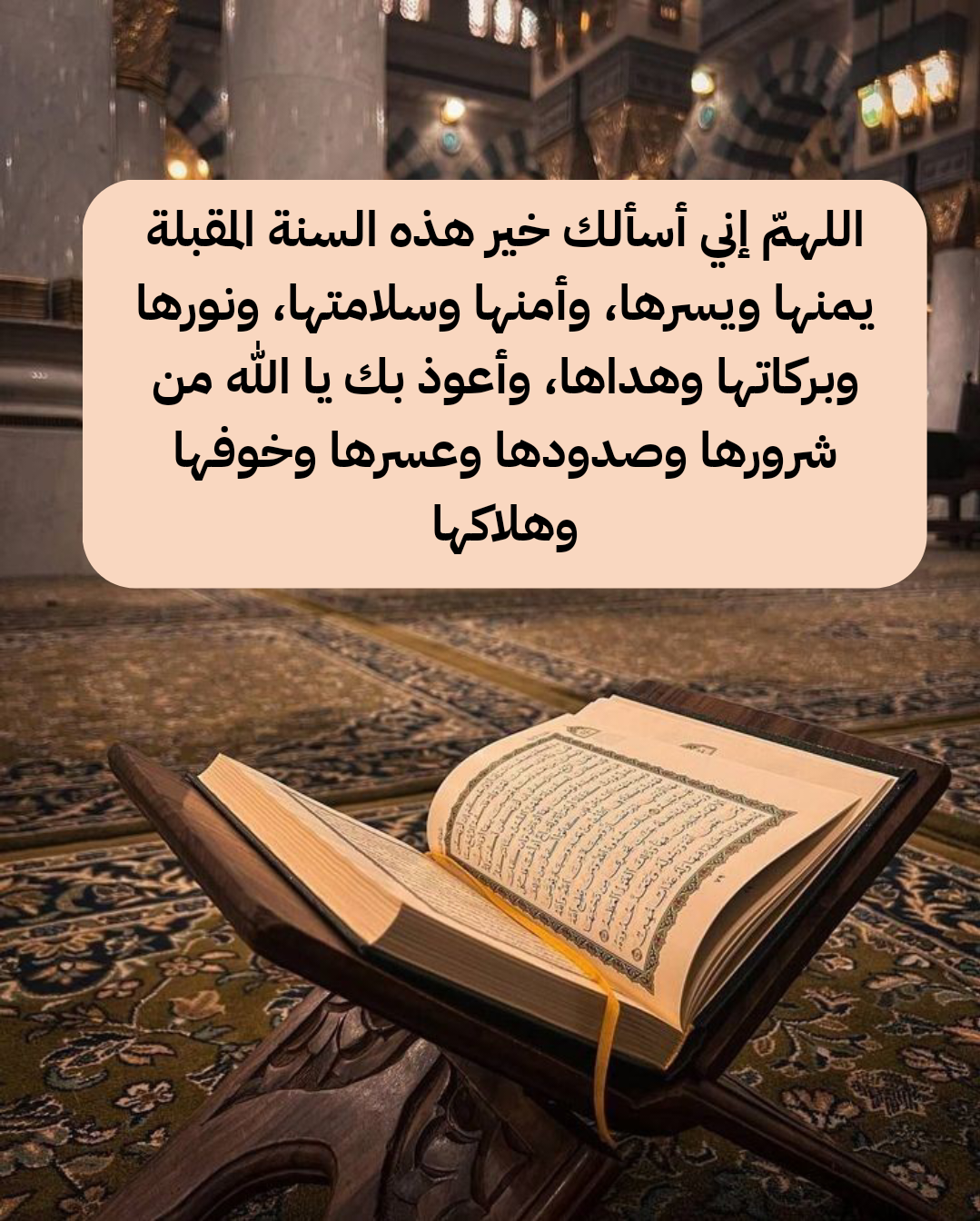 - اللهم إننا نسألك خير هذه السنة القادمة أمنها وسكينتها وسعادتها، ونعوذ بك من شرورها وعسرها وأحزانها ونسألك أن تحفظ علينا ديننا الذي هو أساس أمرنا، ودنيانا التي فيها معاشنا، وأن ترشدنا لما تحب وترضى، وأن تيسر لنا كل خير في الدنيا والآخرة، يا أكرم الأكرمين ويا أرحم الراحمين.