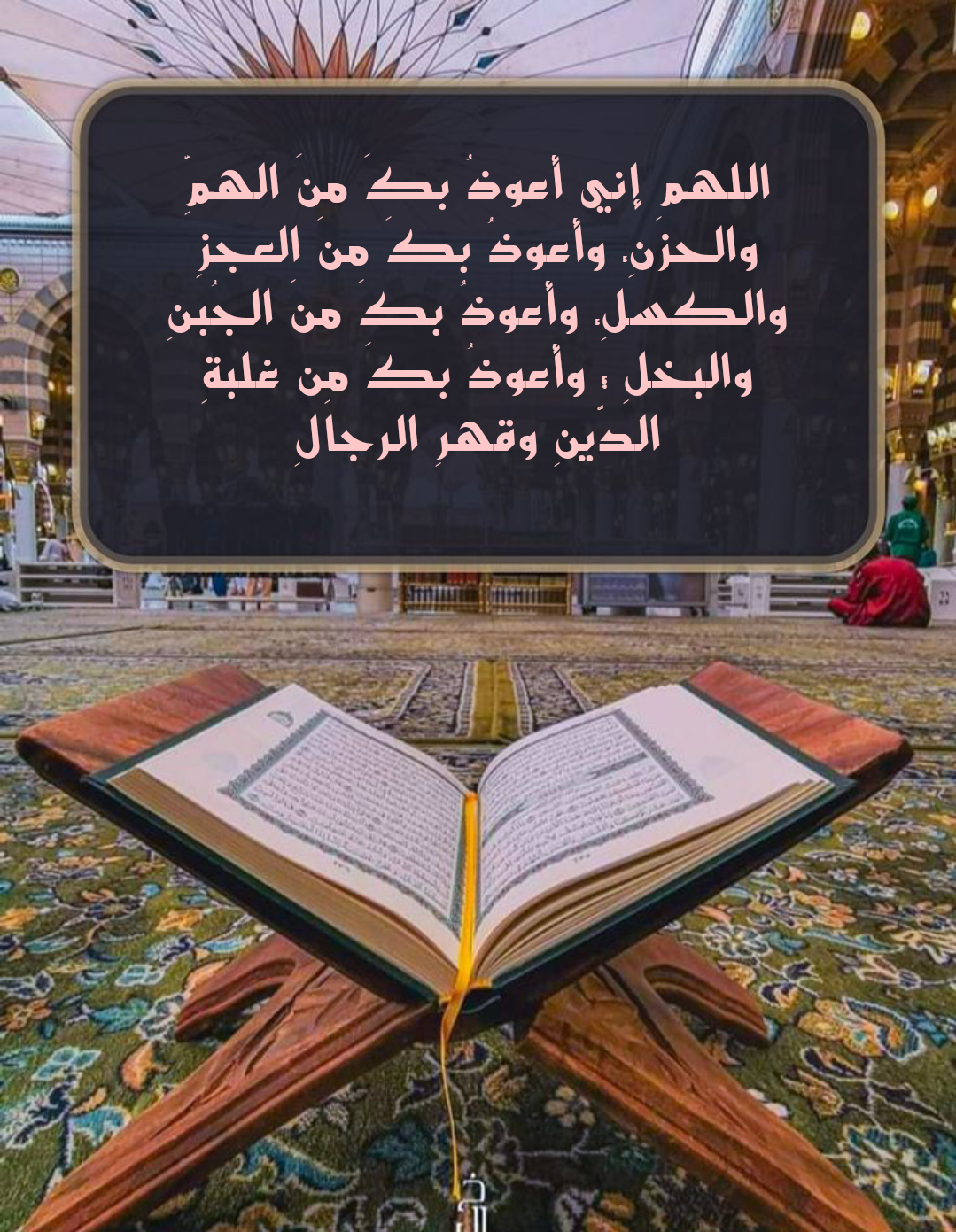 “اللَّهُمَّ إِنِّي أَعُوذُ بِكَ مِنَ الْهَمِّ وَالْحَزَنِ، وَالْعَجْزِ وَالْكَسَلِ، وَالْبُخْلِ وَالْجُبْنِ، وَضَلَعِ الدَّيْنِ، وَغَلَبَةِ الرِّجَالِ”.