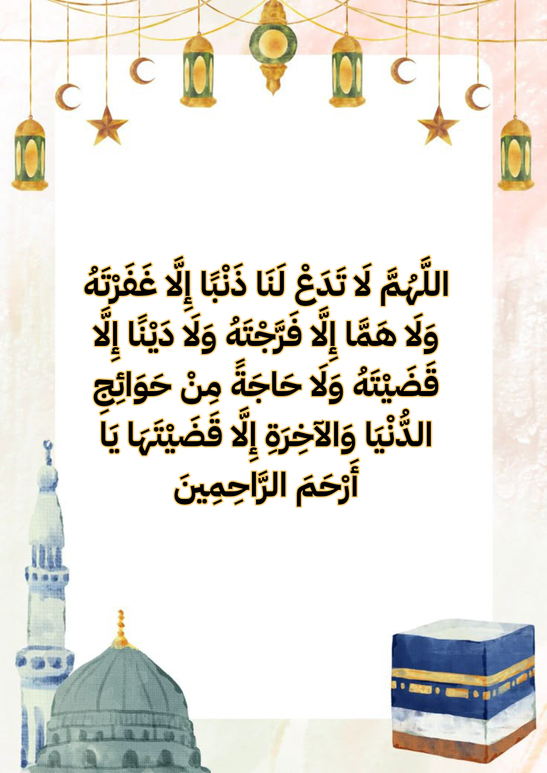 • اللَّهُمَّ سَلِّمْنَا لِرَمَضَانَ، وَسَلِّمْ رَمَضَانَ لَنَا، وَتَسَلَّمْهُ مِنَّا مُتَقَبَّلًا يَا رَبَّ الْعَالَمِينَ.