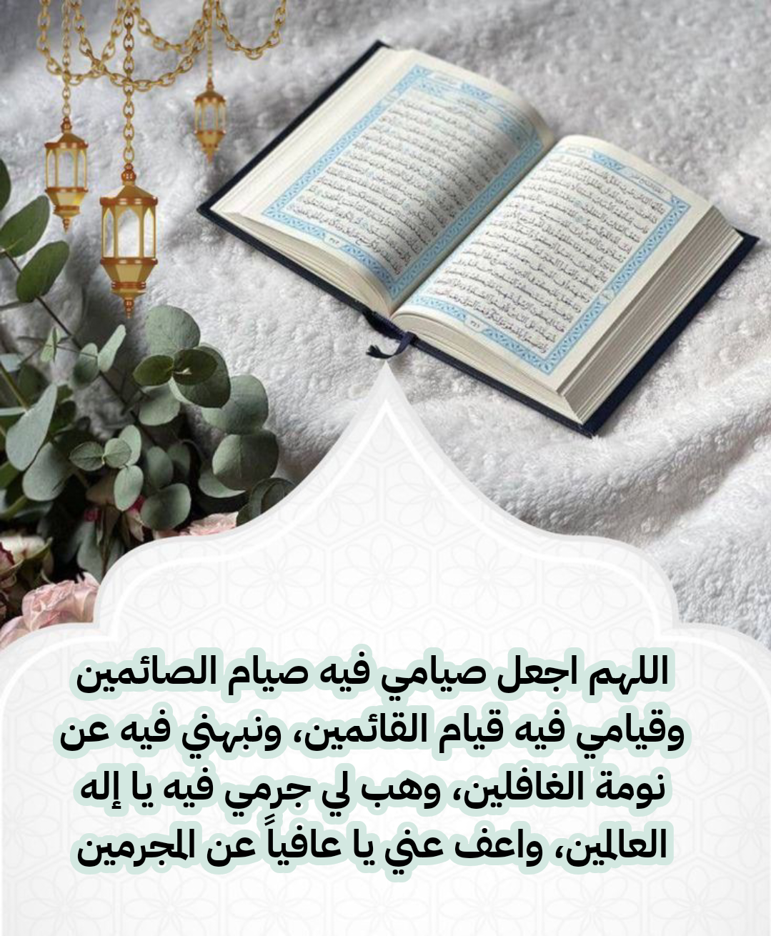 - اللَّهُمَّ اجْعَلْ صِيَامِي فِيهِ صِيَامَ الصَّائِمِينَ، وَقِيَامِي فِيهِ قِيَامَ الْقَائِمِينَ، وَنَبِّهْنِي فِيهِ عَنْ نَوْمَةِ الْغَافِلِينَ، وَهَبْ لِي جُرْمِي فِيهِ يَا إِلَهَ الْعَالَمِينَ، وَاعْفُ عَنِّي يَا عَافِيًا عَنِ الْمُجْرِمِينَ.