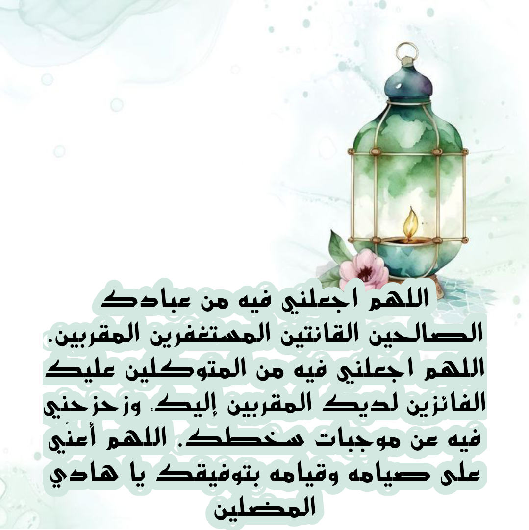 - اللَّهُمَّ اجْعَلْنَا فِي هَذَا الشَّهْرِ مِنْ عُتَقَائِكَ مِنَ النَّارِ، وَمِنَ الْمَقْبُولِينَ الْفَائِزِينَ.