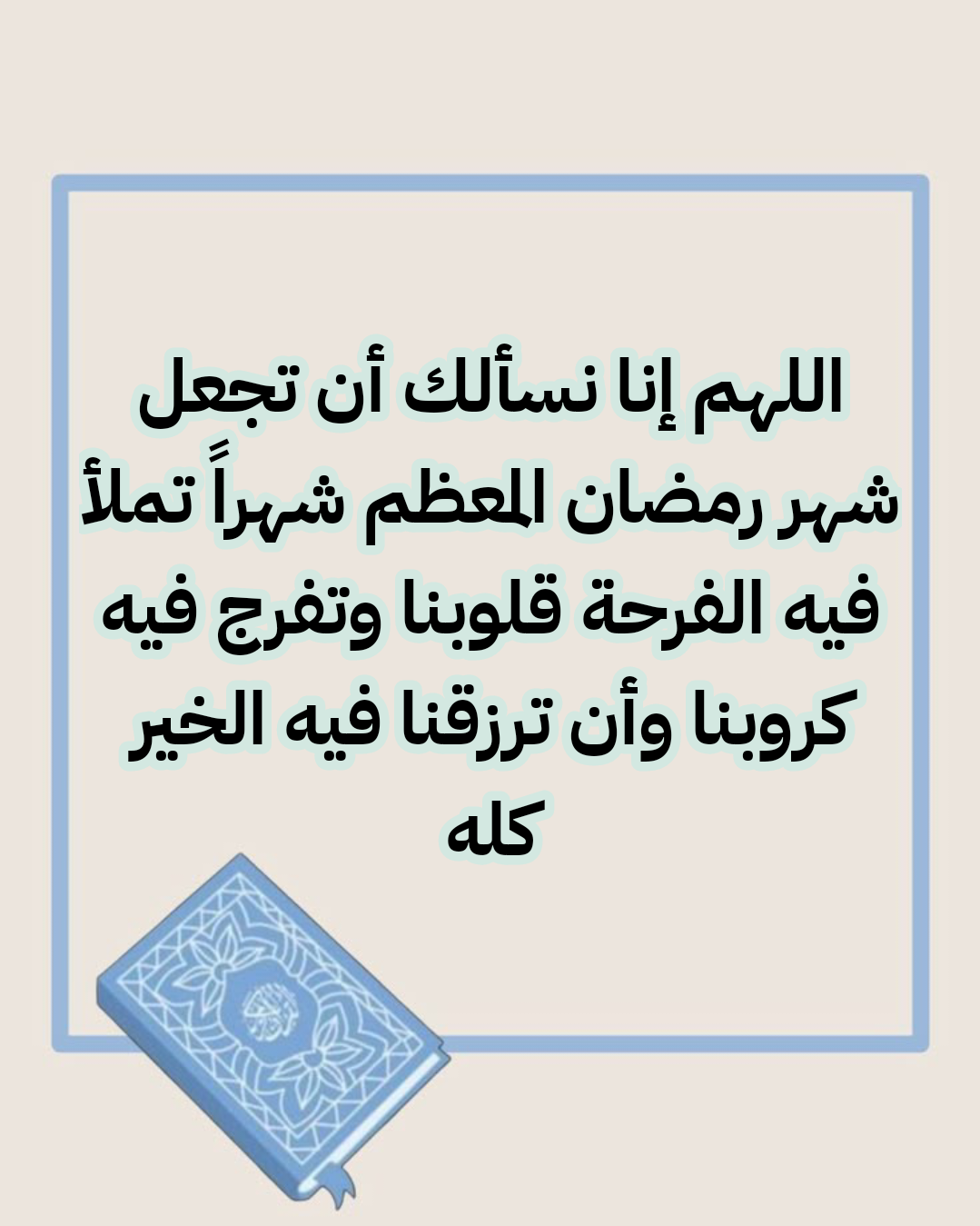 - اللَّهُمَّ بَلِّغْنَا رَمَضَانَ وَنَحْنُ فِي أَحْسَنِ حَالٍ، وَأَعِنَّا عَلَى صِيَامِهِ وَقِيَامِهِ وَتِلَاوَةِ كِتَابِكَ عَلَى الْوَجْهِ الَّذِي يُرْضِيكَ عَنَّا.