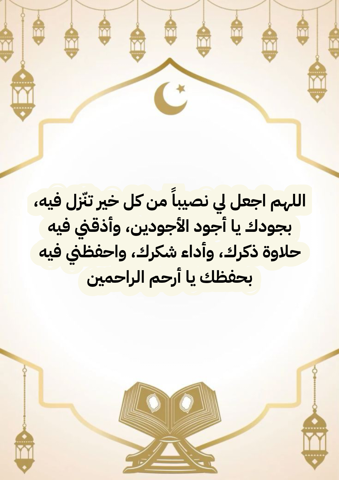 - اللَّهُمَّ قَرِّبْنِي فِيهِ إِلَى مَرْضَاتِكَ، وَجَنِّبْنِي فِيهِ مِنْ سَخَطِكَ وَنَقِمَاتِكَ، وَوَفِّقْنِي فِيهِ لِقِرَاءَةِ آيَاتِكَ، بِرَحْمَتِكَ يَا أَرْحَمَ الرَّاحِمِينَ.