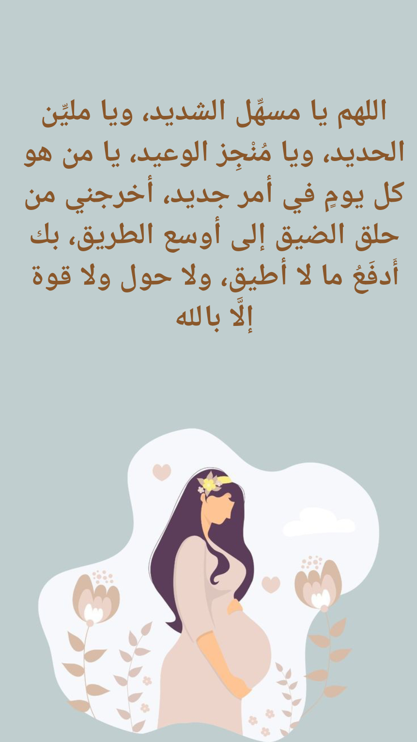 - “ربي إني مسني الضر وأنت أرحم الراحمين، اللهم اكشف عني هذا الكرب، ويسِّر لي أمري، واكتب لي ولطفلي السلامة التامة.”.