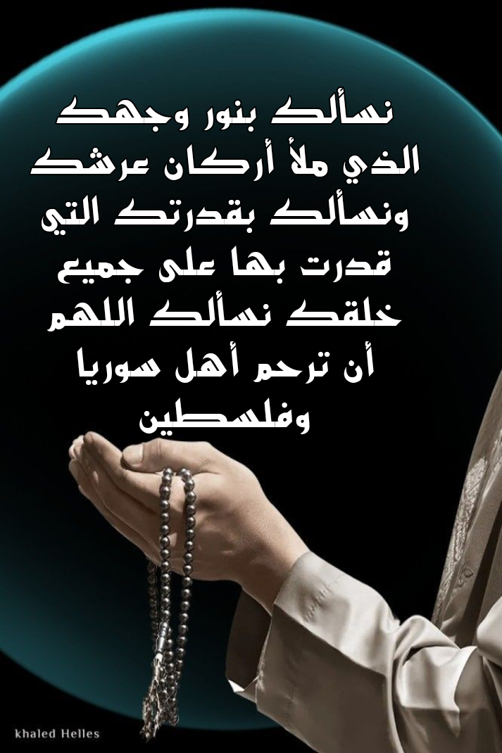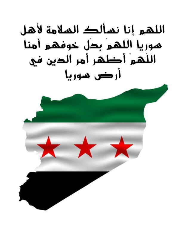 • اللَّهُمَّ يا ذا الجلالِ والإكرام، يا حيُّ يا قيوم، برحمتِك نستغيث، أصلح لأهلنا في سوريا شأنهم كله ولا تكلهم إلى أنفسهم طرفة عين، اللَّهُمَّ فرّج كربهم، واشفِ مريضهم، وارحم ميتهم، واجعل لهم من كل ضيقٍ مخرجًا، ومن كل همٍّ فرجًا.