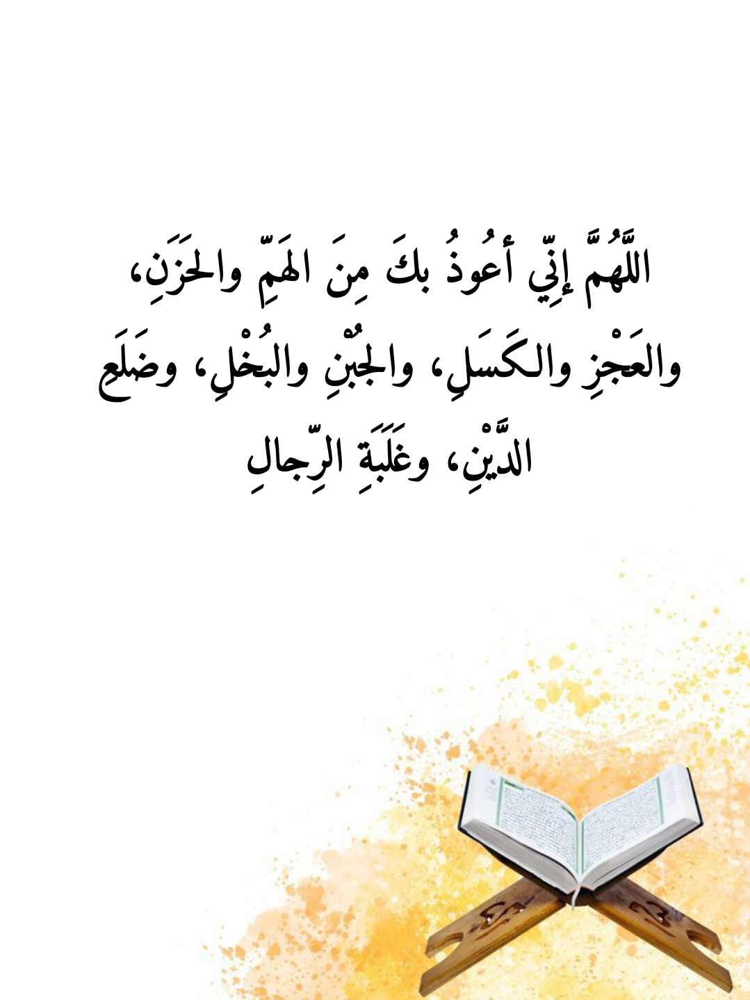 اللهمَّ إني عبدُك وابنُ عبدِك وابنُ أَمَتِك ناصيتي بيدِك ماضٍ فيَّ حكمُك عادلٌ فيَّ قضاؤُك أسألُكَ بكلِّ اسمٍ هو لك سميت به نفسك أو أنزلته في كتابِك أو علمته أحدًا مِن خلقِك أو استأثرتَ به في علمِ الغيب عندَك أن تجعلَ القرآنَ العظيم نورَ صدري وربيعَ قلبي وجلاءَ حزني وذهابَ همي