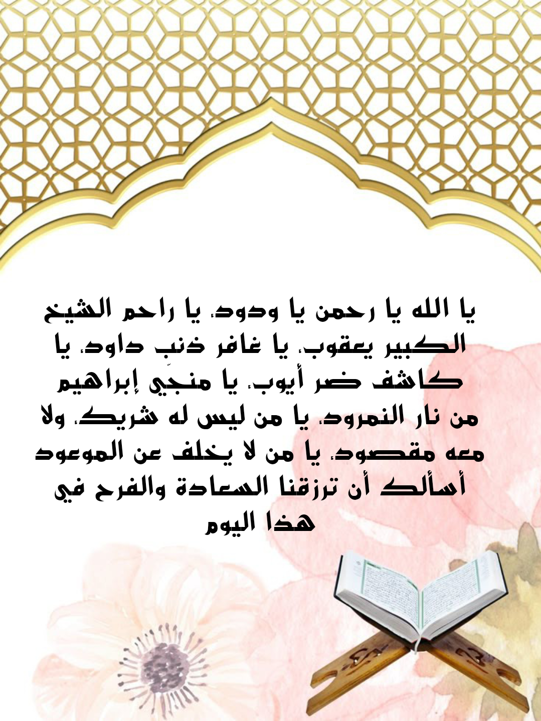 • لتفريج الكروب وتيسير الأمور: “اللَّهُمَّ رَحْمَتَكَ أَرْجُو، فَلَا تَكِلْنِي إِلَى نَفْسِي طَرْفَةَ عَيْنٍ، وَأَصْلِحْ لِي شَأْنِي كُلَّهُ، لَا إِلَهَ إِلَّا أَنْتَ”، (المصدر: سنن أبي داود، حديث رقم 5090، حديث حسن).