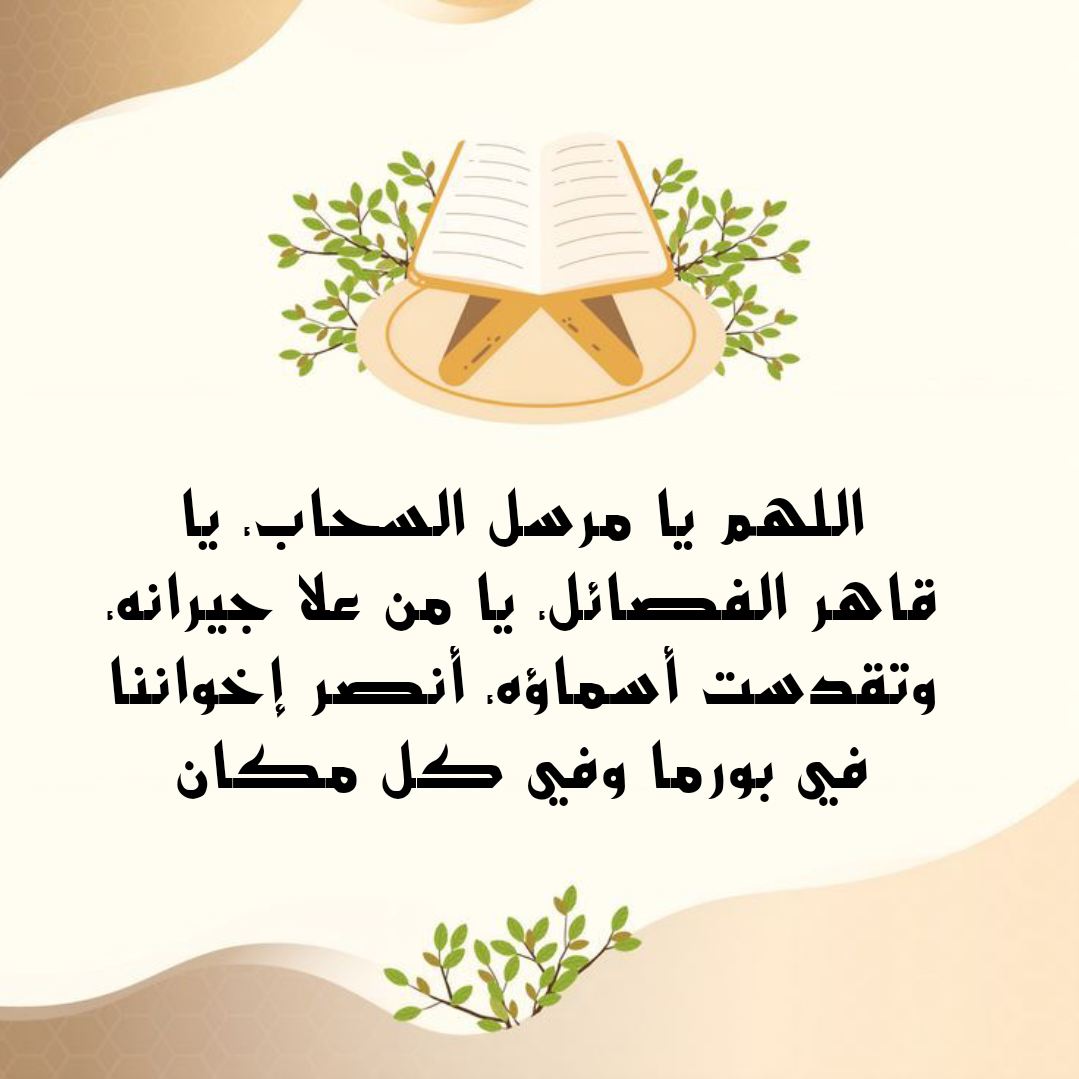 - اللَّهُمَّ يا ناصر المستضعفين، ويا ولي المؤمنين، نسألك بعزتك التي لا تُرام، وملكك الذي لا يُضام، أن تكون عونًا لإخواننا المسلمين في بورما.