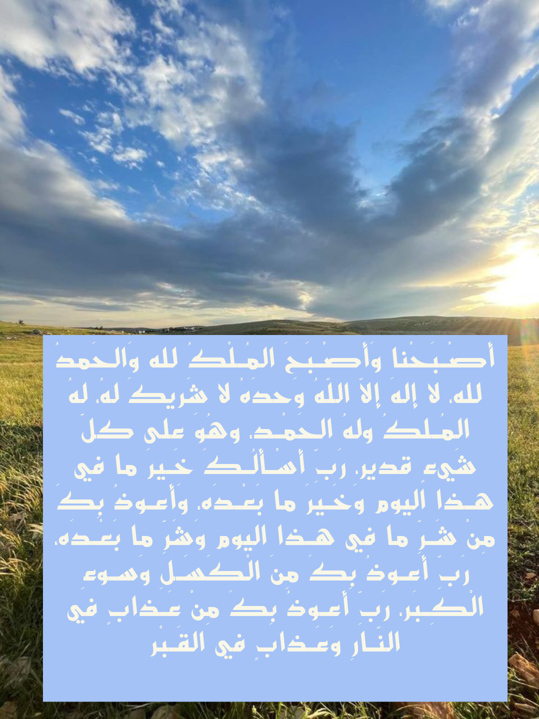 “أَصْبَحْنَا وَأَصْبَحَ الْمُلْكُ لِلَّهِ، وَالْحَمْدُ لِلَّهِ، لا إِلَهَ إِلا اللَّهُ وَحْدَهُ لا شَرِيكَ لَهُ، لَهُ الْمُلْكُ وَلَهُ الْحَمْدُ وَهُوَ عَلَى كُلِّ شَيْءٍ قَدِيرٌ، رَبِّ أَسْأَلُكَ خَيْرَ مَا فِي هَذَا الْيَوْمِ وَخَيْرَ مَا بَعْدَهُ، وَأَعُوذُ بِكَ مِنْ شَرِّ مَا فِي هَذَا الْيَوْمِ وَشَرِّ مَا بَعْدَهُ، رَبِّ أَعُوذُ بِكَ مِنَ الْكَسَلِ وَسُوءِ الْكِبَرِ، رَبِّ أَعُوذُ بِكَ مِنْ عَذَابٍ فِي النَّارِ وَعَذَابٍ فِي الْقَبْرِ”