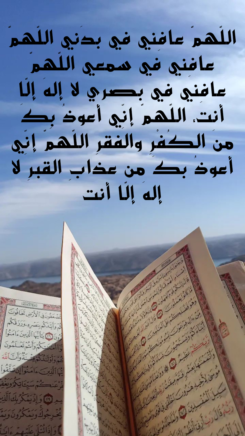 “اللَّهُمَّ عَافِنِي فِي بَدَنِي، اللَّهُمَّ عَافِنِي فِي سَمْعِي، اللَّهُمَّ عَافِنِي فِي بَصَرِي، لا إِلَهَ إِلا أَنْتَ، اللَّهُمَّ إِنِّي أَعُوذُ بِكَ مِنَ الْكُفْرِ وَالْفَقْرِ، وَأَعُوذُ بِكَ مِنْ عَذَابِ الْقَبْرِ، لا إِلَهَ إِلا أَنْتَ”