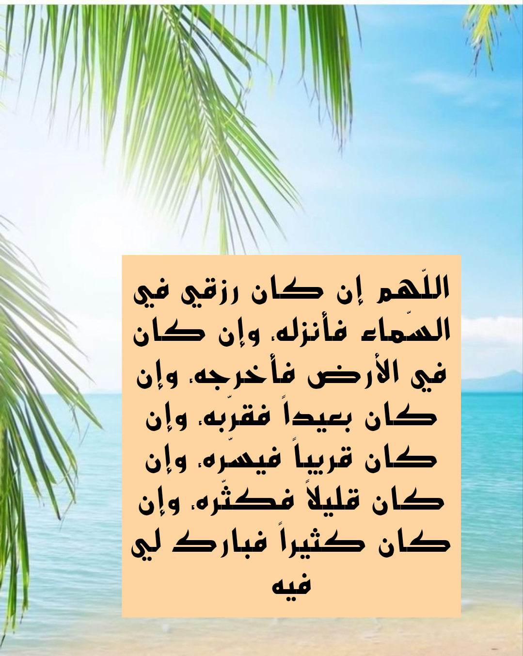 • اللهم يا من بيده كل شيء، يا من تقول للشيء كن فيكون، أسألك رحمتك التي تغنيني بها عن رحمة من سواك، وأن تيسر لي أمري كله وتفتح لي أبواب الخير.