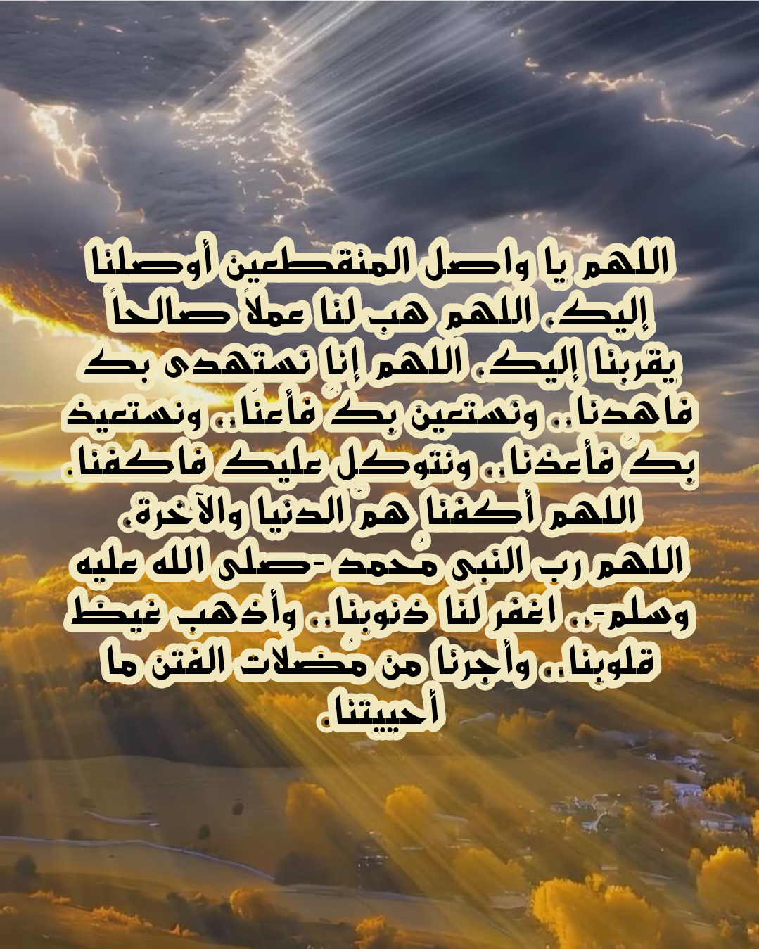 - “اللَّهُمَّ إِنَّا نَسْأَلُكَ الْعَفْوَ وَالْعَافِيَةَ فِي الدِّينِ وَالدُّنْيَا وَالْآخِرَةِ، اللَّهُمَّ إِنَّا نَعُوذُ بِكَ مِنْ زَوَالِ نِعْمَتِكَ، وَتَحَوُّلِ عَافِيَتِكَ، وَفُجَاءَةِ نِقْمَتِكَ، وَجَمِيعِ سَخَطِكَ”.