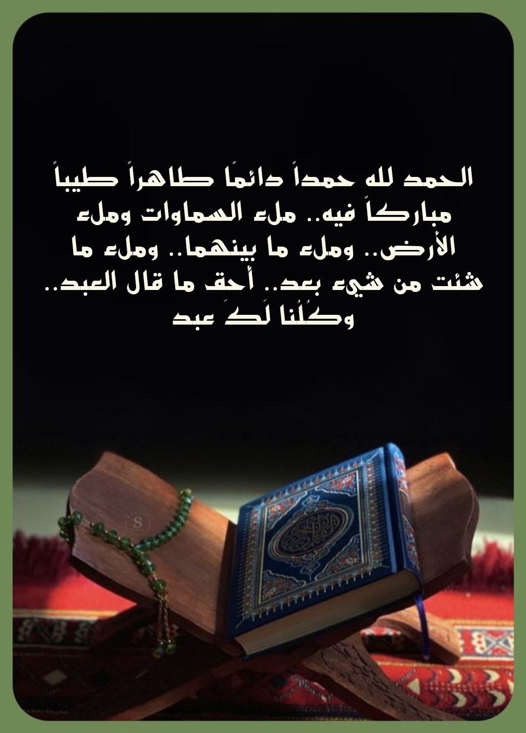 - “الْحَمْدُ لِلَّهِ حَمْدًا دَائِمًا طَيِّبًا كَثِيرًا مُبَارَكًا فِيهِ كَمَا يُحِبُّ رَبُّنَا وَيَرْضَى، اللَّهُمَّ لَكَ الْحَمْدُ كُلُّهُ، وَلَكَ الشُّكْرُ كُلُّهُ، وَإِلَيْكَ يُرْجَعُ الْأَمْرُ كُلُّهُ”.