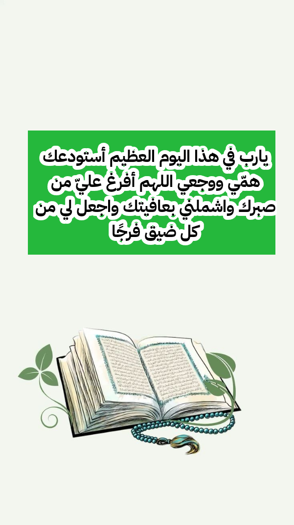 - اللَّهُمَّ اجْعَلْ القُرْآنَ العَظِيمَ رَبِيعَ قَلْبِي، وَنُورَ صَدْرِي، وَجَلَاءَ حُزْنِي، وَذَهَابَ هَمِّي، اللَّهُمَّ ثَبِّتْنِي عَلَى دِينِكَ القَوِيمِ، وَأَصْلِحْ لِي شَأْنِي كُلَّهُ، وَلَا تَكِلْنِي إِلَى نَفْسِي طَرْفَةَ عَيْنٍ.