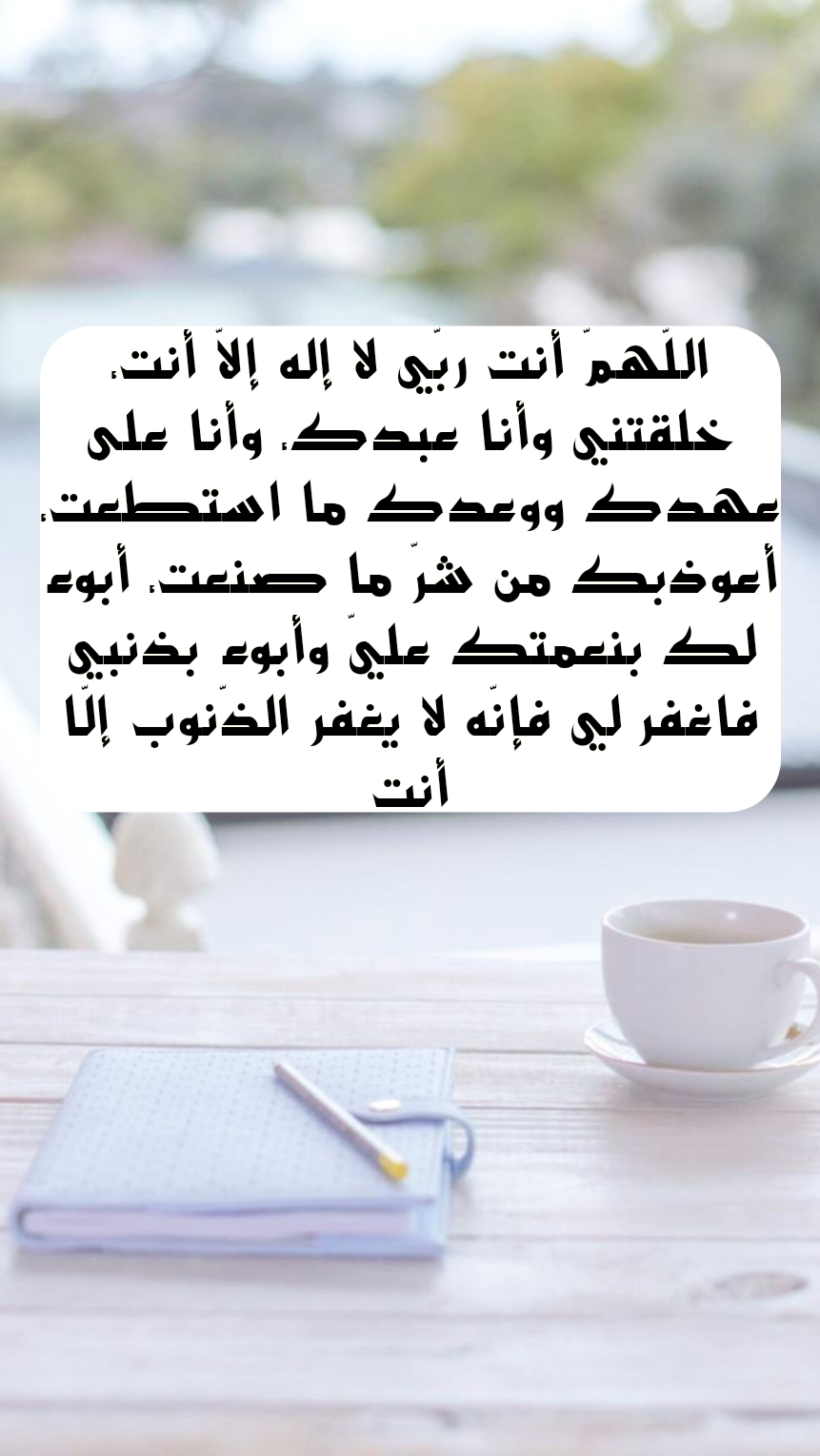 “اللَّهُمَّ أَنْتَ رَبِّي لا إِلَهَ إِلا أَنْتَ، خَلَقْتَنِي وَأَنَا عَبْدُكَ، وَأَنَا عَلَى عَهْدِكَ وَوَعْدِكَ مَا اسْتَطَعْتُ، أَعُوذُ بِكَ مِنْ شَرِّ مَا صَنَعْتُ، أَبُوءُ لَكَ بِنِعْمَتِكَ عَلَيَّ، وَأَبُوءُ لَكَ بِذَنْبِي فَاغْفِرْ لِي، فَإِنَّهُ لا يَغْفِرُ الذُّنُوبَ إِلا أَنْتَ”.