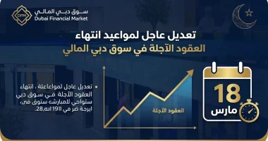 ويهيب سوق دبي المالي بجميع المستثمرين وشركات الوساطة ضرورة مراعاة هذه التحديثات في خططهم التداولية، والتأكد من إغلاق أو ترحيل المراكز المالية قبل نهاية جلسة تداول غدٍ الأربعاء 18 مارس 2026.