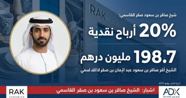 سيراميك رأس الخيمة تعتمد توزيع أرباح نقدية بنسبة 20% بإجمالي 198.7 مليون درهم عن عام 2025