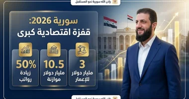أعلن الرئيس السوري أحمد الشرع، اليوم الجمعة 20 مارس 2026، عن انطلاق مرحلة جديدة وحاسمة من التعافي الاقتصادي في البلاد، شملت حزمة قرارات تاريخية لتحسين مستوى المعيشة وتعزيز البنية التحتية، جاء ذلك خلال استقباله للمهنئين بقدوم عيد الفطر السعيد في “قصر الشعب” بالعاصمة دمشق، حيث كشف عن أرقام الموازنة العامة الجديدة التي تعكس تعافياً كبيراً في مؤشرات الدولة المالية.