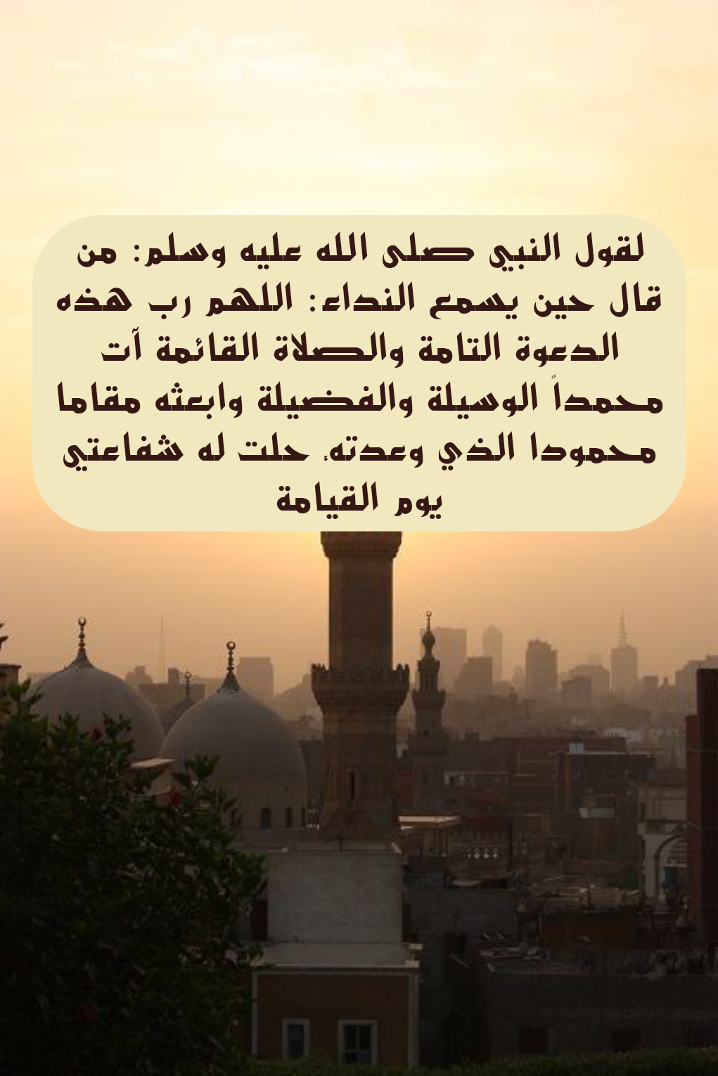 اللَّهُمَّ رَبَّ هَذِهِ الدَّعْوَةِ التَّامَّةِ، وَالصَّلاَةِ الْقَائِمَةِ، آتِ مُحَمَّدًا الْوَسِيلَةَ وَالْفَضِيلَةَ، وَابْعَثْهُ مَقَامًا مَحْمُودًا الَّذِي وَعَدْتَهُ