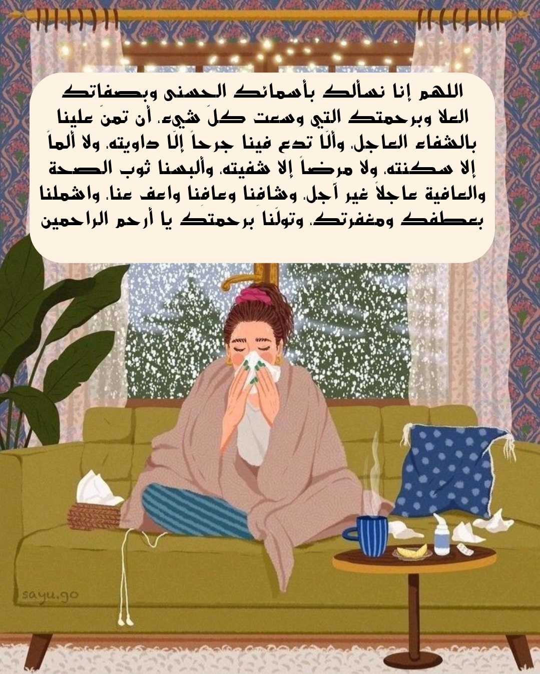 • يا الله، يا من أمره بين الكاف والنون، نسألك أن تفرّج كرب المكروبين، وتزيل بأس المرضى، وتمنّ عليهم بالصحة والعافية، اللهم احفظهم بحفظك، واكلأهم برعايتك يا أرحم الراحمين.