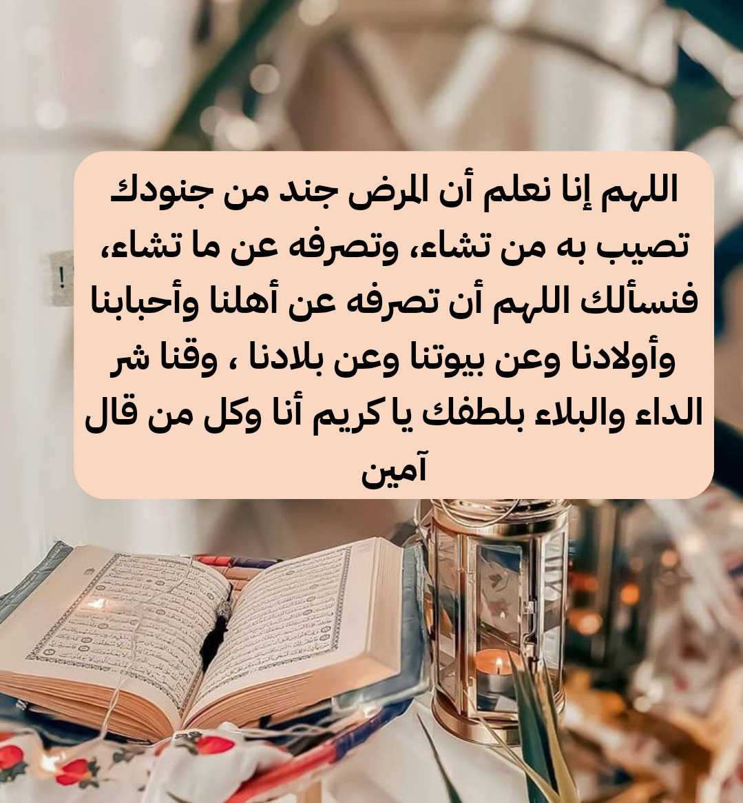 - اللَّهُمَّ اشْفِ كُلَّ مَرِيضٍ، وَارْحَمْ كُلَّ مَيِّتٍ، وَبَارِكْ لَنَا فِي صِحَّتِنَا وَعَافِيَتِنَا، وَتَقَبَّلْ أَعْمَالَنَا وَدَعَوَاتِنَا يَا أَرْحَمَ الرَّاحِمِينَ.