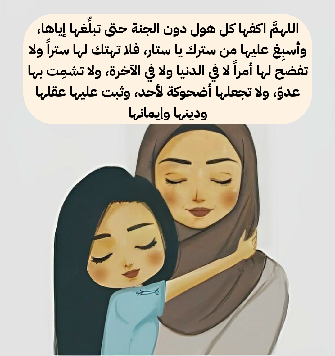 - اللَّهُمَّ يَا مَالِكَ السَّمَاوَاتِ وَالأَرْضِ، اجْعَلْ أُمِّي فِي وَدَائِعِكَ، وَأَبْعِدْ عَنْهَا شَرَّ الحَاسِدِينَ، وَاصْرِفْ عَنْهَا كُلَّ مَكْرُوهٍ، وَأَنِرْ دَرْبَهَا بِنُورِ الهِدَايَةِ، وَاجْعَلْهَا مِنْ عِبَادِكَ الصَّالِحِينَ.