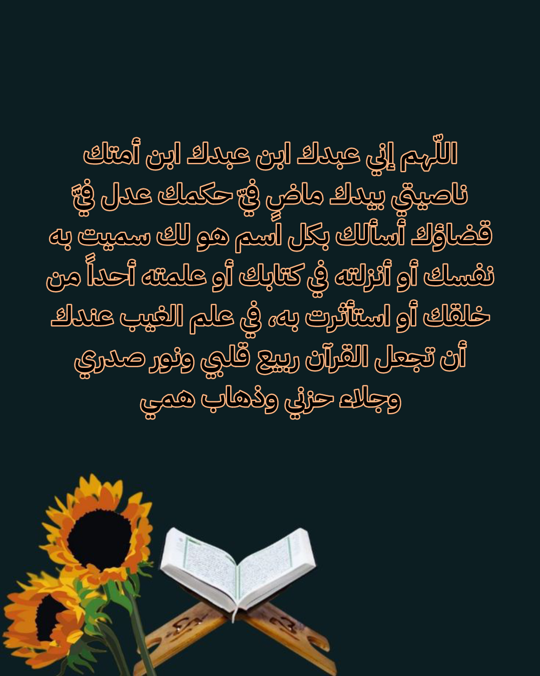 “اللَّهُمَّ إِنَّا عَبِيدُكَ، وَبَنُو عَبِيدِكَ، وَبَنُو إِمَائِكَ، نَوَاصِينَا بِيَدِكَ، مَاضٍ فِينَا حُكْمُكَ، عَدْلٌ فِينَا قَضَاؤُكَ، نَسْأَلُكَ بِكُلِّ اسْمٍ هُوَ لَكَ سَمَّيْتَ بِهِ نَفْسَكَ، أَوْ عَلَّمْتَهُ أَحَدًا مِنْ خَلْقِكَ، أَوْ أَنْزَلْتَهُ فِي كِتَابِكَ، أَوِ اسْتَأْثَرْتَ بِهِ فِي عِلْمِ الْغَيْبِ عِنْدَكَ، أَنْ تَجْعَلَ الْقُرْآنَ رَبِيعَ قُلُوبِنَا، وَنُورَ صُدُورِنَا، وَجِلَاءَ أَحْزَانِنَا، وَذَهَابَ هُمُومِنَا”.