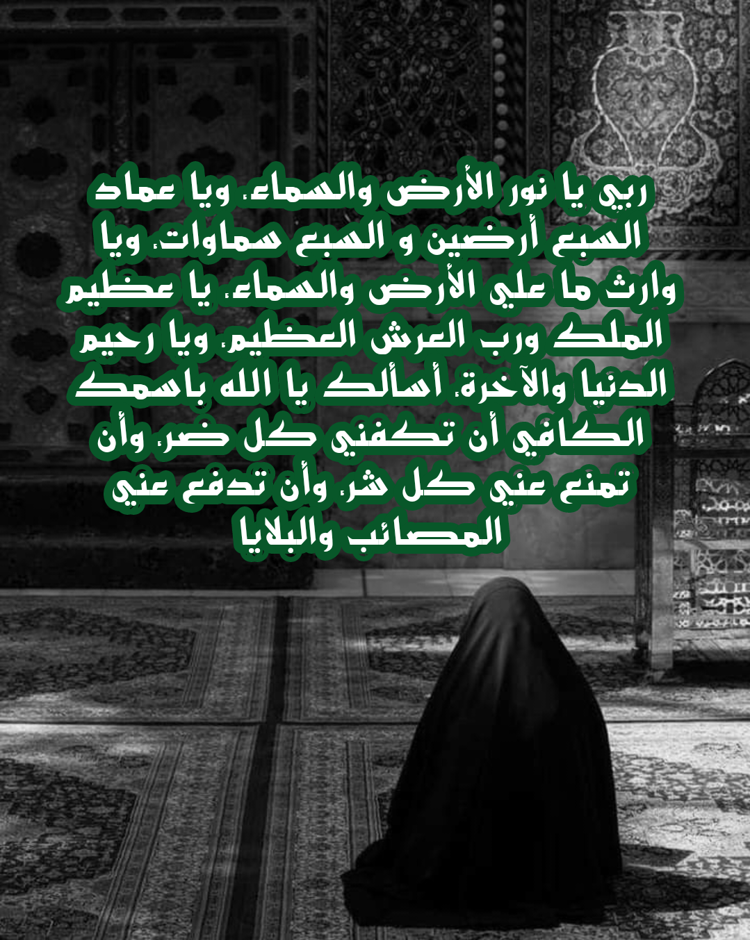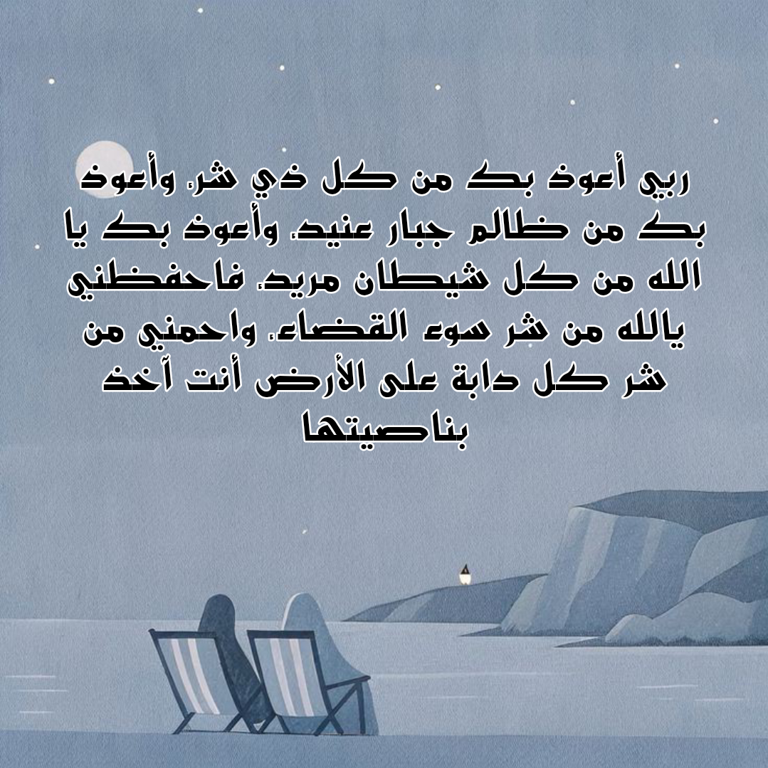 - يَا رَبِّ، أَسْتَوْدِعُكَ نَفْسِي وَأَهْلِي وَمَنْ أُحِبُّ، فَاحْفَظْنَا بِعَيْنِكَ الَّتِي لَا تَنَامُ، وَاكْفِنَا بِرُكْنِكَ الَّذِي لَا يُرَامُ.