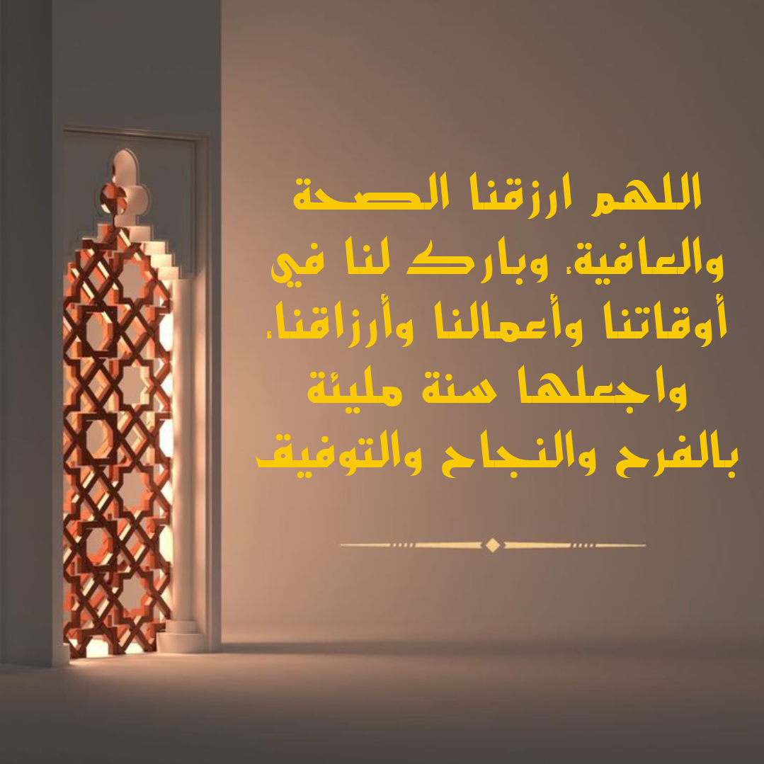 - يَا رَبِّ، مَعَ بِدَايَةِ عَامٍ جَدِيدٍ مِنْ حَيَاتِي، أَسْأَلُكَ أَنْ تَجْعَلَهُ أَفْضَلَ مِمَّا مَضَى، وَأَنْ تَمْلَأَهُ بِالرِّضَا وَالسَّعَادَةِ وَالْقُرْبِ مِنْكَ، وَاحْفَظْ لِي فِيهِ أَهْلِي وَأَحِبَّتِي.