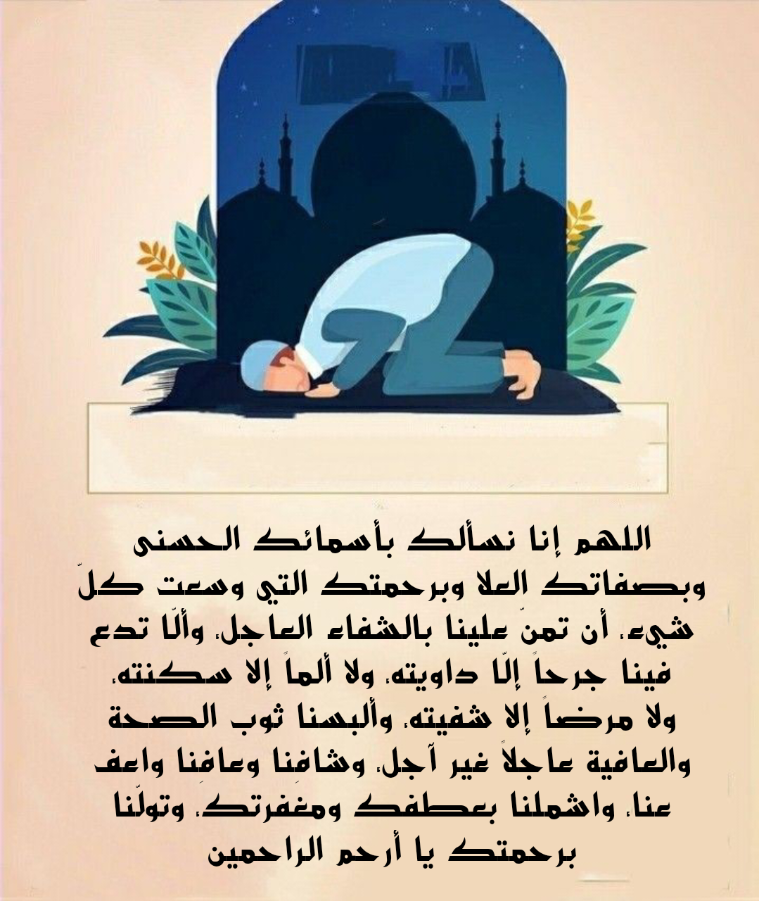 عندما يشتد المرض بالإنسان، يكون اللجوء إلى الله تعالى بالدعاء الصادق هو أعظم أسباب الشفاء والطمأنينة، فالمرض ابتلاءٌ من الله، فيه تكفير للسيئات ورفعة للدرجات، وهو فرصة ليعود العبد إلى ربه متضرعًا، موقنًا أن الشفاء بيده وحده، وإن كان الأصل في الدعاء هو الالتزام بما ورد في القرآن الكريم والسنة النبوية الصحيحة، إلا أن بعض الصيغ العامة قد انتشرت بين الناس لمعانيها الطيبة.