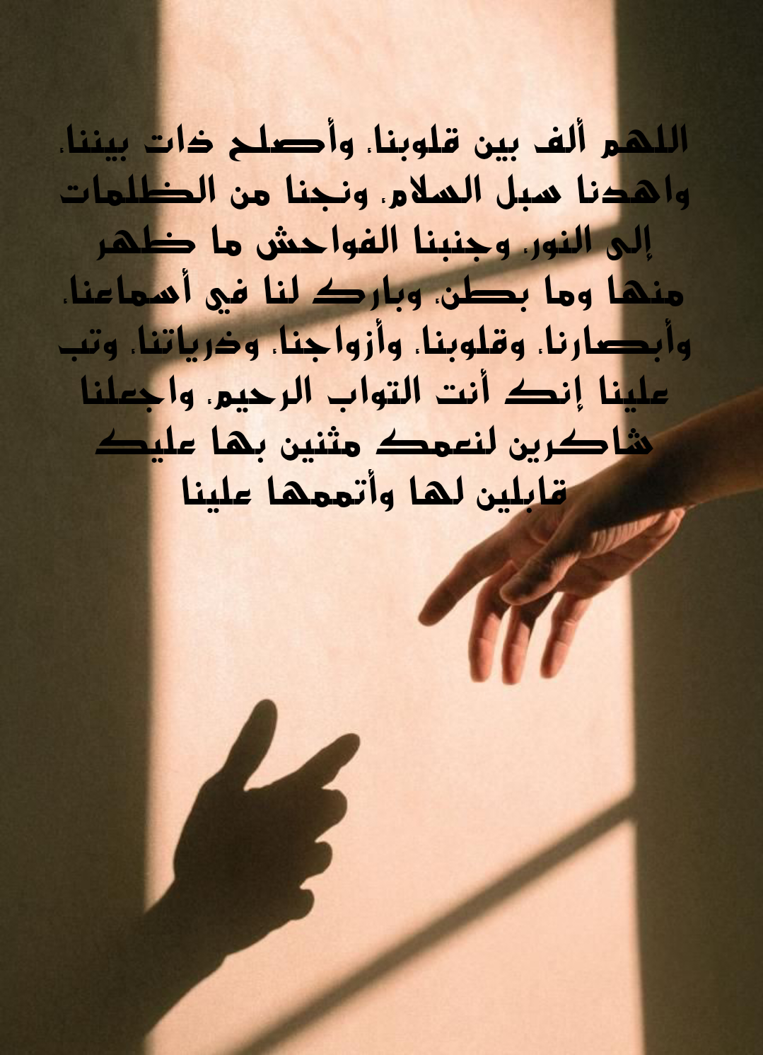 “اللَّهُمَّ أَلِّفْ بَيْنَ قُلُوبِنَا، وَأَصْلِحْ ذَاتَ بَيْنِنَا…”