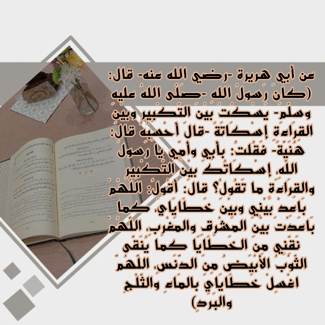 عن أبي هريرة رضي الله عنه قال: كَانَ رَسُولُ اللَّهِ ﷺ إِذَا كَبَّرَ فِي الصَّلاةِ، سَكَتَ هُنَيْهَةً قَبْلَ أَنْ يَقْرَأَ، فَقُلْتُ: يَا رَسُولَ اللَّهِ، بِأَبِي أَنْتَ وَأُمِّي، أَرَأَيْتَ سُكُوتَكَ بَيْنَ التَّكْبِيرِ وَالْقِرَاءَةِ، مَا تَقُولُ؟ قَالَ: أَقُولُ:
