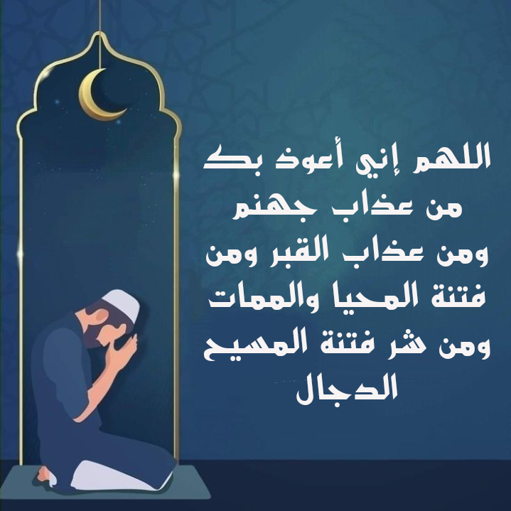 اللَّهُمَّ إِنِّي أَعُوذُ بِكَ مِنْ عَذَابِ جَهَنَّمَ، وَمِنْ عَذَابِ الْقَبْرِ، وَمِنْ فِتْنَةِ الْمَحْيَا وَالْمَمَاتِ، وَمِنْ شَرِّ فِتْنَةِ الْمَسِيحِ الدَّجَّالِ.