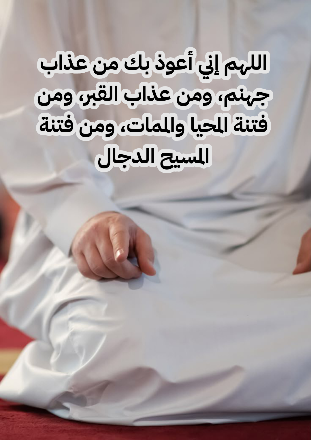 “اللَّهُمَّ إنِّي أَعُوذُ بِكَ مِنْ عَذَابِ جَهَنَّمَ، وَمِنْ عَذَابِ الْقَبْرِ، وَمِنْ فِتْنَةِ الْمَحْيَا وَالْمَمَاتِ، وَمِنْ شَرِّ فِتْنَةِ الْمَسِيحِ الدَّجَّالِ”.