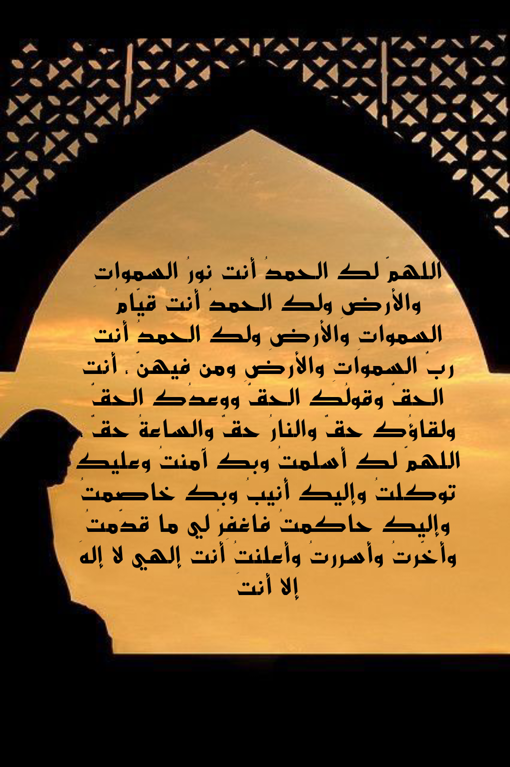 “اللَّهُمَّ لَكَ الحَمْدُ أَنْتَ قَيِّمُ السَّمَوَاتِ وَالأَرْضِ وَمَنْ فِيهِنَّ، وَلَكَ الحَمْدُ لَكَ مُلْكُ السَّمَوَاتِ وَالأَرْضِ وَمَنْ فِيهِنَّ، وَلَكَ الحَمْدُ أَنْتَ نُورُ السَّمَوَاتِ وَالأَرْضِ وَمَنْ فِيهِنَّ، وَلَكَ الحَمْدُ أَنْتَ مَلِكُ السَّمَوَاتِ وَالأَرْضِ، وَلَكَ الحَمْدُ أَنْتَ الحَقُّ وَوَعْدُكَ الحَقُّ، وَلِقَاؤُكَ حَقٌّ، وَقَوْلُكَ حَقٌّ، وَالجَنَّةُ حَقٌّ، وَالنَّارُ حَقٌّ، وَالنَّبِيُّونَ حَقٌّ، وَمُحَمَّدٌ صَلَّى اللهُ عَلَيْهِ وَسَلَّمَ حَقٌّ، وَالسَّاعَةُ حَقٌّ، اللَّهُمَّ لَكَ أَسْلَمْتُ، وَبِكَ آمَنْتُ، وَعَلَيْكَ تَوَكَّلْتُ، وَإِلَيْكَ أَنَبْتُ، وَبِكَ خَاصَمْتُ، وَإِلَيْكَ حَاكَمْتُ، فَاغْفِرْ لِي مَا قَدَّمْتُ وَمَا أَخَّرْتُ، وَمَا أَسْرَرْتُ وَمَا أَعْلَنْتُ، أَنْتَ المُقَدِّمُ، وَأَنْتَ المُؤَخِّرُ، لاَ إِلَهَ إِلَّا أَنْتَ”.