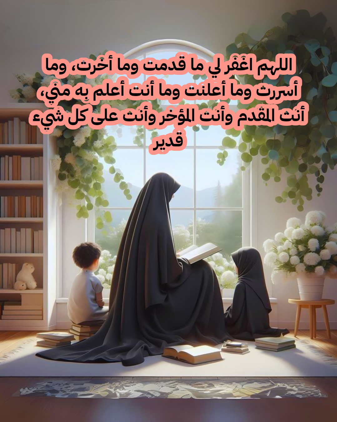 - يَا رَبِّ، يَا كَرِيمُ، يَا وَاسِعَ الْمَغْفِرَةِ، اغْفِرْ لِي ذُنُوبِي كُلَّهَا، مَا عَلِمْتُ مِنْهَا وَمَا لَمْ أَعْلَمْ، وَأَصْلِحْ لِي شَأْنِي كُلَّهُ، وَاجْعَلْنِي مِنْ عِبَادِكَ الْمُخْلِصِينَ.