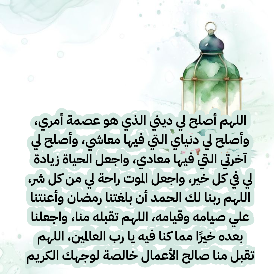 - اللَّهُمَّ ارْزُقْنِي بَرَكَةَ هَذَا الصِّيَامِ، وَاجْعَلْهُ سَبَبًا لِرِفْعَةِ دَرَجَاتِي، وَحَبِّبْ إِلَيَّ الْقُرْآنَ وَاجْعَلْنِي مِنْ أَهْلِهِ، وَتَقَبَّلْ مِنِّي صَلَاتِي وَسَائِرَ أَعْمَالِي.